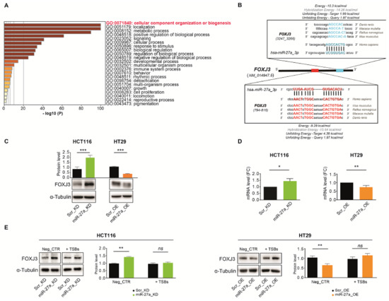To identify new miR-27a target(s) that could affect mitochondrial functionality in CRC, we used the miRWalk target prediction tool with the single miRNA search [25]. miR-27a-3p is the predominant form of miR-27a in CRC and affects mitochondrial metabolism through several factors, as we previously reported [18,19]. We found that 11238 genes were recognized as targets and functionally classified by using several pathway databases and/or manually curating data from the literature (see Section 2: Materials and Methods). Out of these, we selected 1335 predicted targets related to the activity and organization of mitochondria, as several human and cancer development pathologies have been correlated with mitochondrial dysfunction. We then used Metascape to perform the functional enrichment analysis of the predicted targets and to identify the most affected pathways [26]. Figure 1A shows gene sets whose members were significantly overrepresented in the input gene list and reported in the bar graph based on their statistical significance. “cellular component organization or biogenesis” turned out to be the pathway most influenced by miR-27a. Among the genes we initially classified as miR-27a targets and implicated in the abovementioned most recognized pathway, we selected FOXJ3 because the literature suggests that it is the leader factor of mitochondrial biogenesis. Thus far, FOXJ3 has been shown to act as a master regulator of this process within skeletal muscle, cardiomyocytes, and neurons [17,32,33]. We thus investigated its possible involvement in CRC.