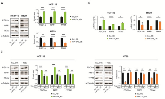 We thus evaluated whether miR-27a, through the modulation of FOXJ3, has any role in the biogenetic process in our CRC cell model system. PGC1-α, NRF1, and TFAM were evenly upregulated in miR-27a_KD cells with respect to their relative Scr_KD controls, paralleling FOXJ3 in Western blot analysis. In contrast, they were equally reduced in miR-27a_OE compared to Scr_OE cells (Figure 2A).