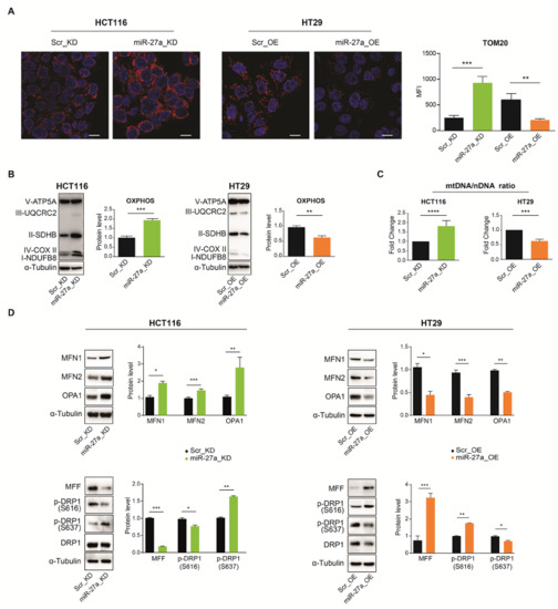 Finally, we verified whether mitochondrial dynamics was also affected by miR-27a, as this event is strictly interconnected with biogenesis. As shown in Figure 3D, we used Western blot analysis and found that the expression of Mitofusin 1 and 2 (MFN1 and 2) and OPA1, major players in mitochondrial membrane fusion [8,46], was higher in miR-27a_KD than the relative Scr_KD cells. In contrast, their expression in miR-27a_OE was lower than that in Scr_OE cells, in an inverse correlation with miR-27a. The Mitochondrial Fission Factor (MFF) was more expressed in Scr_KD than miR-27a_KD cells. MFF is anchored to the outer membrane and recruits the Dynamin-Related Protein 1 (DRP1) that undergoes oligomerization and phosphorylation, thus triggering mitochondrial fission [47,48]. In line, DRP1 displayed higher phosphorylation at S616 (activating) and lower phosphorylation at S637 (inhibitory) in Scr_KD than miR-27a_KD cells. In HT29 cells, MFF and DRP1 phosphorylation showed the opposite behavior: MFF was more expressed in miR-27a_OE cells, and DRP1 exhibited higher phosphorylation at S616 and lower phosphorylation at S637 than its Scr_OE counterpart, in line with miR-27a levels. All these results indicate that miR-27a negatively modulates mitochondrial content, thus favoring fragmentation.