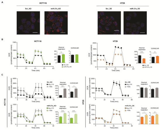 Finally, we evaluated the mitochondrial membrane potential (ΔΨ) by using TMRE (tetramethylrhodamine ethyl ester), a red–orange dye that accumulates in mitochondria. By confocal microscopy imaging, we showed that cells with low levels of miR-27a (miR-27a_KD and Scr_OE cells) transfected with the Neg_CTR accumulated more dye than those overexpressing miR-27a (Scr_KD and miR-27a_OE cells), indicating that they had a higher membrane polarization potential and more functional mitochondria (Figure 5A).