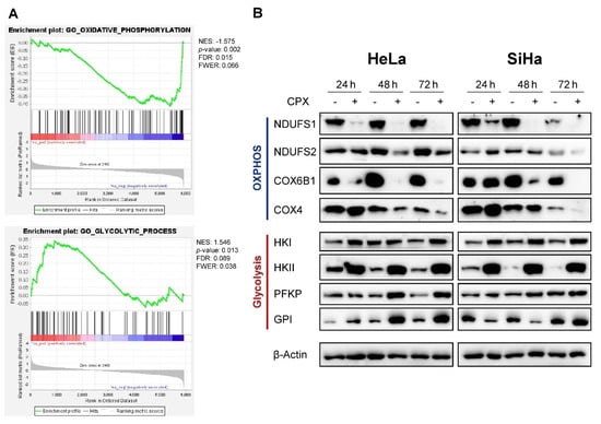 Ciclopirox (CPX) downregulates oxidative phosphorylation (OXPHOS)-related factors and upregulates glycolysis-related factors in cervical cancer cells. (A) Proteome analyses of SiHa cells treated with 10 µM CPX for 48 h. Experiments were performed in triplicate, and data were analyzed via gene set enrichment analysis (GSEA). Enrichment plots of the gene sets “GO_glycolytic_process” and “GO_oxidative_phosphorylation” are shown. NES: normalized enrichment score; FDR: false discovery rate; FWER: family-wise error rate. (B) Immunoblot analyses of HeLa or SiHa cells treated for 24, 48, or 72 h with 10 µM CPX (+) or solvent control EtOH (-), assessing protein levels of exemplary factors involved in OXPHOS or glycolysis. NDUFS1, NDUFS2: NADH:Ubiquinone oxidoreductase core subunits S1 and S2; COX6B1, COX4: cytochrome c oxidase subunits 6B1 and 4. HKI and HKII: hexokinase I and II; PFKP: phosphofructokinase; GPI: glucose-6-phosphate isomerase; β-Actin: representative loading control.
