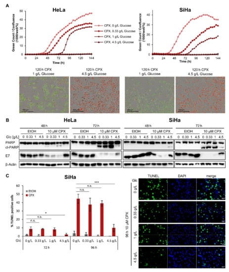 Increased glucose availability protects cells against CPX-induced apoptosis. (A) For the quantification of cell death, HeLa mKate2 or SiHa mKate2 cells were treated for up to 144 h with 10 µM CPX under the indicated glucose levels in the presence of 100 nM IncuCyte® Cytotox Green Reagent. Images were acquired every 4 h and dead cells were quantified as green counts per well and normalized to the confluence in percent (upper panels). Exemplary images after 120 h of treatment are shown, viable cells can be identified by red labelled nuclei, dead cells fluoresce green due to Cytotox activation (lower panels). Scale bars: 400 µm. Glc: glucose. (B) Immunoblot analyses of PARP, cleaved PARP (cl-PARP), and HPV18 or HPV16 E7 expression levels in HeLa or SiHa cells, respectively, treated with 10 µM CPX or solvent control (EtOH) for 48 or 72 h in the presence of the indicated amounts of glucose. β-Actin: representative loading control. (C) Quantification of the percentage of TUNEL positive SiHa cells after 72 or 96 h treatment with solvent control or 10 µM CPX under the indicated glucose levels (left panel). The average of three replicates is shown, error bars represent standard deviations. n.s.: non-significant; * = p ≤ 0.05; *** = p ≤ 0.001. Representative images of the TUNEL assays (right panel) depict cells after 96 h CPX treatment. Scale bars: 50 µm.