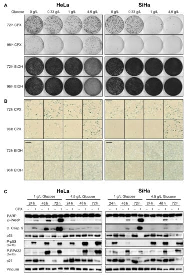 To verify that this glucose-dependent form of CPX-induced cell death is apoptosis, we performed immunoblot analyses of the apoptosis marker cl-(cleaved-)PARP (poly(ADP-ribose)polymerase). We observed a strong accumulation of cl-PARP in cervical cancer cells after 72 h of CPX treatment under lower glucose concentrations (0 to 1 g/L), but not under higher glucose concentrations (4.5 g/L) (Figure 2B). Moreover, the CPX-induced downregulation of the HPV oncoprotein E7 is counteracted by an increased glucose supply, which has similarly been observed for hypoxia- or metformin-induced repression of the HPV oncogenes [28,30].