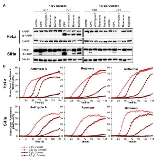We found that the three latter compounds also induce apoptosis in cervical cancer cells, as indicated by increased PARP cleavage and enhanced cytotoxicity in live-cell imaging analyses. Both rotenone and metformin treatment lead to a robust increase in PARP cleavage after 72 h under 1 g/L glucose (Figure 4A, left panels). As observed for CPX (Figure 2B), this effect is again strongly counteracted for both drugs by supplying the cells with 4.5 g/L glucose (Figure 4A, right panels). Antimycin A also leads to increased cl-PARP amounts in HeLa cells at 1 g/L glucose. This, however, is not detectable in SiHa cells, possibly due to the fact that antimycin A can lead to a substantial downregulation of total PARP amounts (Figure 4A). Similar to CPX (Figure 2A), all three OXPHOS inhibitors induce cell death under 1 g/L glucose, as visualized by cytotoxicity assays (Figure 4B). This response of cervical cancer cells towards the OXPHOS inhibitors is further facilitated under decreased glucose availability (0.33 g/L) or in the absence of glucose. In contrast, increased glucose availability (4.5 g/L) efficiently blocks the induction of cell death.