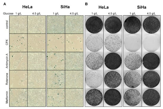 The lack of senescence induction in cervical cancer cells by the OXPHOS inhibitors antimycin A, rotenone, or metformin in the presence of increased glucose availability is further corroborated by the CFAs performed in parallel. As senescence is an irreversible growth arrest, cells which become senescent should no longer be able to form colonies upon release from treatment. After treatment for 72 h under 4.5 g/L glucose and subsequent drug release, we found that only CPX treatment, but not treatment with either antimycin A, rotenone, or metformin, strongly blocks the colony formation potential of cervical cancer cells (Figure 5B).