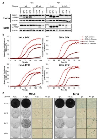 Iron chelators induce apoptosis in a glucose-dependent manner and act pro-senescent under increased glucose availability. (A) Immunoblot analyses of PARP and cl-PARP levels in HeLa or SiHa cells, treated with the indicated iron chelators under 1 g/L or 4.5 g/L glucose for 48 or 72 h. β-Actin: representative loading control. (B) Cytotoxicity assays of HeLa mKate2 or SiHa mKate2 cells treated with deferasirox (DFX) or deferoxamine (DFO) over the course of 144 h under the indicated glucose concentrations. Green object count indicating the number of dead cells was assessed every 4 h and normalized to cell confluence. (C) CFAs and concomitant senescence assays of HeLa or SiHa cells treated with the indicated iron chelators for 72 h under 1 g/L or 4.5 g/L glucose. After treatment, cells were split and cultured in drug-free medium (containing 1 g/L glucose) for further 4 days (senescence assays) or 13 days (CFAs). Scale bars: 200 µm. In Figure 6A–C, the following drug concentrations were used: 10 µM CPX; 50 µM DFX; 100 µM DFO.