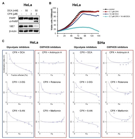 CPX acts synergistically with glycolysis inhibitors. (A) Immunoblot analyses of PARP, cl-PARP, and HPV18 E7 levels in HeLa cells after 48 h treatment with CPX and DCA as indicated. β-Actin: loading control. (B) Growth curves of HeLa mKate2 cells treated with the indicated doses of CPX and DCA. Red object count indicating viable cells was assessed every 4 h over a period of 144 h using the IncuCyte® S3 live-cell imaging system. (C) HeLa mKate2 or SiHa mKate2 cells were treated with varying doses of CPX and the indicated OXPHOS or glycolysis inhibitors with a constant drug ratio over the course of 5 days. Every 4 h, viable cell count was assessed. Fraction affected (Fa) vs. combination index (CI) plots were created with the CompuSyn software, based on viable cell count. Data from one representative experiment each are illustrated. All experiments depicted in Figure 7 were performed under a concentration of 1 g/L glucose.