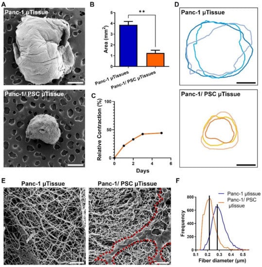 PSC-mediated contraction of PDAC µtissues. (A) Scanning electron microscopy (SEM) images for Panc-1 µtissues (top) and Panc-1/PSC µtissues (bottom) (scale bar = 500 µm). (B) Quantification of the µtissue size based on SEM images. (C) Relative contraction of Panc-1/PSC µtissues for a culture duration of 5 days. (D) Individual outlines for 3 individual Panc-1 µtissues (top) and Panc-1/PSC µtissues (bottom) (scale bar = 500 µm). (E) SEM images of the surface structure of Panc-1 µtissues (left) and Panc-1/PSC µtissues (right). Red outline highlighting PSC on the surface of hydrogel (scale bar = 10 µm). (F) Quantification of the fiber diameter based on SEM images. Data represent mean ± standard error of the mean for at least 3 independent experiments. Statistical analysis was performed by two-tailed Student’s t-test. ** p < 0.01.