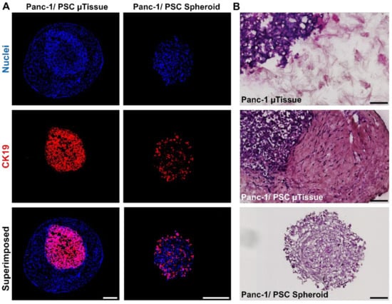 Cellular arrangement of Panc-1/PSC µtissues. (A) Immunofluorescent staining against CK19 (red) and nuclei (blue) for Panc-1/PSC µtissues and Panc-1/PSC heterospheroids (scale bar = 250 µm). (B) Hematoxylin-Eosin (HE) staining for Panc-1 µtissues, Panc-1/PSC µtissues and Panc-1/PSC heterospheroids (scale bar = 100 µm).