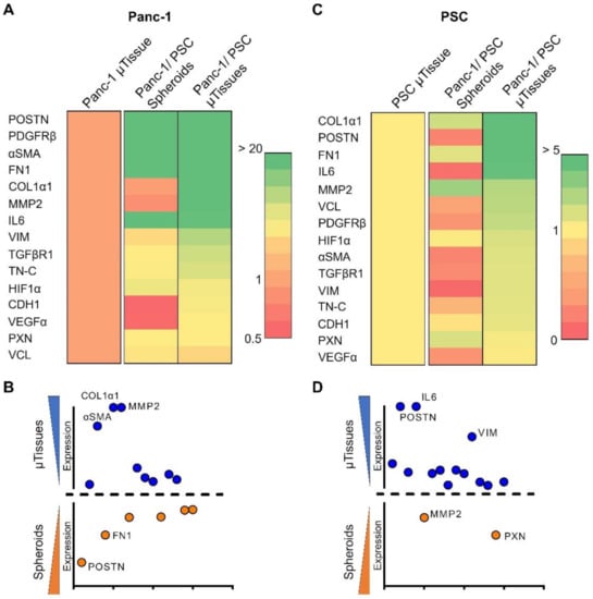 Gene profile of the interaction between Panc-1 cells and PSCs. (A) Heat map of expressed genes in Panc-1 cancer cells for Panc-1 µtissues, Panc-1/PSC heterospheroids and Panc-1/PSC µtissues. (B) Comparison of Panc-1 gene expression in Panc-1/PSC µtissues versus Panc-1/PSC heterospheroids. (C) Heat map of expressed genes in PSC for PSC µtissues, Panc-1/PSC heterospheroids and Panc-1/PSC µtissues. (D) Comparison of PSC gene expression in Panc-1/PSC µtissues versus Panc-1/PSC heterospheroids.