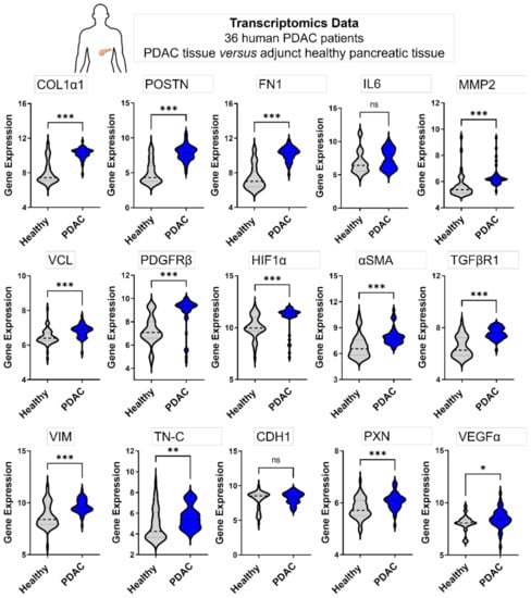 To confirm that the genes upregulated in our Panc-1/PSC µtissues are of relevance to the gene profile of PDAC patients, we performed a transcriptomic analysis of publicly available patient data. Data from 36 PDAC patients was analyzed, where each PDAC tissue and healthy adjunct pancreatic tissue, serving as control, was obtained from the same patient [24,25]. We found that nearly all genes that were reported in literature to play a crucial role in PDAC are indeed found significantly upregulated in PDAC tissues compared to the healthy control (Figure 5). In particular genes that also display a crucial role and significant upregulation in our Panc-1/PSC µtissues such as COL1α1, POSTN, FN1, MMP2 or αSMA. Moreover, VCL, PDGFRβ, TGFβR, and VIM also show a highly significant upregulation in PDAC tissues. The upregulation of these genes in patients and in our Panc-1/PSC µtissues demonstrates the importance of the chosen genes. Interestingly, we found that IL-6, a marker that shows high upregulation in our Panc-1/PSC µtissues, does not display an upregulation in patients. This difference might display certain limitations of our novel model but also indicates the expression of IL-6 might be influenced by other ECM components which dilute the expression causing the lack of upregulation of this marker in PDAC tissues [30,31]. By implementing more cells found in the PDAC microenvironment such as macrophages and by increasing the complexity of our Panc-1/PSC µtissues, it might be possible to further increase the understanding of the different functions of the different PDAC microenvironment components and to determine the contribution of each component to the overall genetic profile of PDAC.