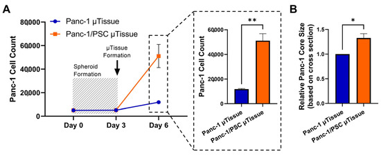 Proliferation of Panc-1 cells in Panc-1/PSC µtissues. (A) Panc-1 cell count in Panc-1 µtissues and Panc-1/PSC µtissues determined by flow cytometry. (B) Size of Panc-1 core in Panc-1 µtissues and Panc-1/PSC µtissues based on HE stained tissue sections (relative size calculated from the measured cross-section area in mm2). Data represent mean ± standard error of the mean for at least 3 independent experiments. Statistical analysis was performed by two-tailed Student’s t-test. * p < 0.05, ** p < 0.01.
