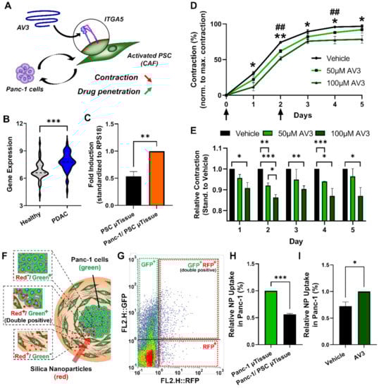 Treatment of Panc-1/PSC µtissues with ITGA5 antagonist AV3. (A) Schematic representation of the mechanism of action of AV3. (B) Expression of ITGA5 in human PDAC patients. (C) Expression of ITGA5 in Panc-1/PSC µtissues compared to PSC µtissues alone. (D) Size of Panc-1/PSC µtissues treated with 50 µM and 100 µM AV3 for a culture duration of 5 days. Arrows indicating days of treatment. * indicates significance comparing treatment with vehicle versus 100 µM AV3. # indicates significance comparing treatment with vehicle versus 50 µM AV3. (E) Relative contraction of Panc-1/PSC µtissues treated with 50 µM and 100 µM AV3 for each day of culture. (F) Schematic representation of the experimental setup demonstrating the penetration of red fluorescent silica nanoparticles into Panc-1/PSC µtissues containing green fluorescent-labelled Panc-1 cancer cells, highlighting cells only positive for nanoparticles (red+/green−), positive for both, nanoparticles and green-labeling (double positive red+/green+) and cells only positive for the green-labeling (red−/green+). (G) Dot plot of flow cytometry analysis highlighting the different subpopulations in the Panc-1/PSC µtissues. (H) Relative number of double-positive cells in Panc-1 µtissues versus Panc-1/PSC µtissues. (I) Relative number of double-positive cells in Panc-1/PSC µtissues treated vehicle (DMSO) or 50 µM AV3 (same Panc-1/PSC µtissues were used for data presented in (H,I)). Data represent mean ± standard error of the mean for at least 3 independent experiments. Statistical analysis was performed by two-tailed Student’s t-test. * p < 0.05, **, ## p < 0.01, *** p < 0.001.