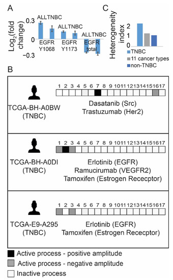 Using a subset of 747 breast cancer tissues from the previously published TCGA dataset [28], which included 3467 tumors profiled for 181 functional oncoproteins each, we examined EGFR/pEGFR expression levels in TNBC and non-TNBC tumors. No significant difference in EGFR/pEGFR expression levels was found between TNBC and non-TNBC tumors (Figure 1A). Examination of the protein–protein co-expression patterns in breast cancer subset, which were determined using information-theoretic surprisal analysis (Figure S1, [18], Table S1), revealed that EGFR protein could be found in several altered sub-networks that characterized both TNBC and non-TNBC tumors. Seventeen altered protein subnetworks (Methods, Figure S1, Table S1), named unbalanced processes, repeated themselves in the breast cancer subset. Each breast, TNBC/non-TNBC, tumor was found to harbor a subset of 1–4 distinct processes out of 17, representing a patient-specific signaling signature, (a PaSSS). An example for three different PaSSSs, characterizing three TNBC tumors, is shown in Figure 1B. For the simplicity of representation, each PaSSS was schematically transformed into a barcode (Figure 1B, Table S1). We found that the TNBC subgroup was relatively heterogeneous, as 74 samples were characterized by 17 different PaSSSs leading to a higher heterogeneity index (Figure 1C), in comparison with the less heterogeneous non-TNBC BRCA subset (673 samples) which were characterized by 84 PaSSSs (Figure 1C).