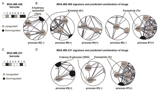 Surprisal analysis predicts efficient drug combinations for TNBC cell lines. (A,B) Barcode (A) representing the set of unbalanced processes in MDA-MB-468 cells, according to PaSSS analysis (B); (C,D) Barcode (C) representing the set of unbalanced processes in MDA-MB-231 cells, according to PaSSS analysis (D). Central protein targets from each process and the corresponding drugs (connected by inhibition arrows) are shown in B and D. (Abbreviations: TNBC—Triple Negative Breast Cancer, pEGFR—phospho Epidermal Growth Factor Receptor, PaSSS—Patient-specific signaling signature, ER—Estrogen receptor, GAPDH—Glyceraldehyde 3-phosphate dehydrogenase, pMEK—phospho Mitogen-activated protein kinase kinase, pERK—phospho Extracellular signal-regulated kinase).