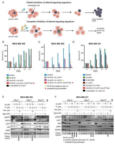 To validate the PaSSS-based strategy, we selected two TNBC cell lines—MDA-MB-468 and MDA-MB-231 from the dataset of 10 different cell lines (Methods), PaSSSs of which were computed previously [18]. These cell lines represent the patient-derived TNBC subset from the TCGA dataset described above: the PaSSS of MDA-MB-468 included EGFR and estrogen receptor, ER, as central targets, thereby corresponding to ~31% TNBC tissues in the TCGA breast cancer subset (Figure 2A,B). MEK/ERK was suggested as an additional central target required for the efficient treatment of MDA-MB-468 cells ([18] and Figure 2A,B). Thus, we predicted that Erlotinib (anti-EGFR), Trametinib (anti -MEK/ERK) and Tamoxifen (Anti-ER; Er + Tr + Tam) should efficiently target the PaSSS of MDA-MB-468 malignancy. MDA-MD-231 cell line did not include EGFR as a part of its PaSSS, similarly to 69% of the TNBC patient-derived tissues. The suggested therapy for MDA-MB-231 cells included Trametinib and the glycolysis inhibitor 2-deoxyglucose (2DG) (Tr + 2DG) (Figure 2C,D and [18]).