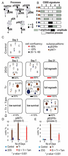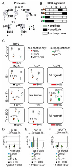 Map of the evolutionary trajectory of MDA-MB-231 cells revealed a switch in signaling state following partial treatment. MDA-MB-231 cells were treated with monotherapies/combination of drugs (Tr, 2DG and Er + Tr + Tam) once a week for 21 days and allowed to regrow. Then, CSSS analysis of single-cell flow cytometry data was performed to map subpopulations that expand in response to different treatments. Cell-specific signaling signature (CSSS) was assigned to each cell which divided the tumor mass into distinct cellular subpopulations. Subpopulations of cells with pAKT+ and pEGFR+ processes comprising more than 1% in any of the experimental conditions are presented and quantified. (A) 5 unbalanced processes, as identified by the analysis, with the central proteins (those having most significant G values, representing the extent of the participation of a protein in processes) are shown. Proteins colored black are anti-correlated with those colored grey. (B) Cells with the same set of unbalanced processes are grouped into subpopulations as represented by different barcodes. Active processes are labeled by either black or grey color. Each barcode (subpopulation) is then color-coded and presented in (C). Proteins labeled in black in (A) are induced in black processes (B). Proteins labeled in grey in (A) are induced in grey processes (B). (C) The evolution of each subpopulation was then followed over time. The size of the circle represents the percentage of subpopulation of cells. (D–F) Percentage of pEGFR+ and pAKT+ cells was quantified for each treatment. Quantification of the subpopulations was performed using at least ~30,000 cells from each condition, which were obtained from at least 3 wells and from at least 2 independent experiments for each time point. p-values for each treatment vs. control are presented. (Abbreviations: Er—Erlotinib, Tr—Trametinib, 2DG—2 deoxyglucose, Tam—Tamoxifen, pEGFR—phospho Epidermal Growth Factor Receptor, pER—phospho Estrogen Receptor, pAKT—phospho Protein kinase B, pS6—phospho Ribosomal protein S6, GAPDH—Glyceraldehyde 3-phosphate dehydrogenase, pERK—phospho Extracellular signal-regulated kinase, CSSS—Cell-specific signaling signature).