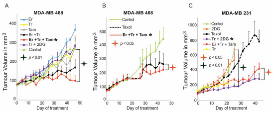 The PaSSS-based drug combinations stopped tumor growth in vivo. MDA-MB-468 (A,B) or MDA-MB-231; (C) cells were injected subcutaneously into mice, and once tumors reached 80 mm3, treatments were initiated. In both cases, the PaSSS-based drug combinations, predicted to collapse the cell line-specific altered signaling signature, inhibited the tumor growth and demonstrated an effect superior to monotherapies or combinations predicted to target partially the PaSSS (see Figure 2 for details regarding the altered signaling signatures and the PaSSS-based drug combinations). The values are mean ± S.E. for at least n = 8 for each condition. (Abbreviations: Er—Erlotinib, Tr—Trametinib, 2DG—2 deoxyglucose, Tam—Tamoxifen, Taxol—Paclitaxel, PaSSS—Patient- specific signaling signature, *—Predicted combination, S.E. —Standard error, n—no of mice).