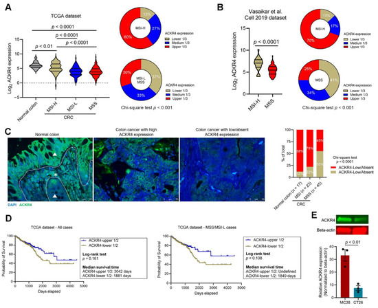 To investigate the immunoregulatory role of ACKR4 in CRC, we first evaluated the ACKR4 expression in CRC and normal colon tissues. Analysis of the CRC dataset in the The Cancer Genome Atlas (TCGA) and another independent dataset reported by Vasaikar et al. [18] showed that ACKR4 expression was lower in CRC than in normal colon tissues (Figure 1A,B). Further stratification of the CRC cases based on the MSI/MSS statuses indicated that ACKR4 expression was lower in MSS/MSI-L tumors than the MSI-H tumors (Figure 1A,B). The immunofluorescence staining on sections of 68 human CRC and 17 normal colon tissues revealed that 88% of normal colon tissues and 78% of MSI-CRC tissues have abundant ACKR4 expression. In contrast, only 45% of MSS-CRC tissues have a similar ACKR4 level. These data confirmed the downregulation of ACKR4 in CRC tissues, especially in the MSS subtype (Figure 1C). Next, we evaluated the prognostic significance of ACKR4 in the TCGA cohort (Figure 1D). Although not statistically significant, patients with higher ACKR4 expression are more likely to have a longer median survival time than patients with lower ACKR4 expression (Figure 1D). To control the influence of MSS/MSI status on the survival benefit, we removed the MSI-H cases and performed a subgroup analysis with the MSS and MSI-L samples. Again, the ACKR4 high cases are more likely to have a better prognosis (Figure 1D). Finally, we determined the ACKR4 level in the mouse CRC cell lines, which are widely used in immunological studies. Notably, the mouse CRC cell line MC38 (MSI phenotype) had significantly higher ACKR4 expression than the CT26 cell line (MSS phenotype) (Figure 1E).