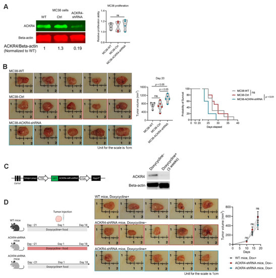 ACKR4 expression and tumor development. (A) Western blot analysis of ACKR4 knockdown in MC38 cell line (The grey area defines the data distribution. The dot lines in the violin plots indicate quartiles). (B) Knockdown of ACKR4 accelerated MC38 tumor growth in naïve C57BL/6J mice (n = 5 for tumor growth analysis and n = 10 for survival analysis). (C) The induction and confirmation of ACKR4 knockdown in transgenic mice. Doxycycline treatment for 3 weeks significantly reduced ACKR4 expression in the mouse skin and subcutaneous connective tissue. (D) Knockdown of ACKR4 in the host mice did not significantly affect MC38 tumor growth (n = 5). (For more than two group statistical analyses, the uppermost p-value indicates the ANOVA-analysis, and other p-values indicate the posthoc analysis between two specific groups. WT: Wild type, Ctrl: Control, shRNA: Short hairpin RNA, Dox: Doxycycline, Col1a1: Collagen, type I, alpha 1, GFP: Green fluorescent protein, HygroR: Hygromycin resistance, PGK: Phosphoglycerate kinase, TRE: Tetracycline response element, ns: No significance, ANOVA: Analysis of variance). Detailed information about the Western blotting can be found in Figures S4 and S5.