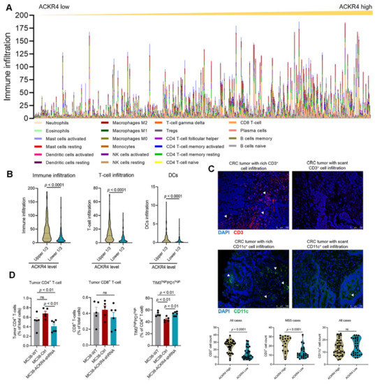 ACKR4 expression and tumor immune cell infiltration. (A,B) The immune profiles of CRC cases in the TCGA dataset generated by the CIBERSORT. Elevated ACKR4 expression is associated with higher total immune cells, T-cells, and DC infiltration (The dot lines in the violin plots indicate quartiles). (C) Immunofluorescence analysis of CD3 and CD11c on human CRC tissues. High ACKR4 expression was associated with high T-cell (CD3+) but not dendritic cell (CD11c+) infiltration (n = 68, the triangles indicate positive staining, the dot lines in the violin plots indicate quartiles). (D) FACS analysis on tumor-infiltrating T-cells on MC38 tumor models. ACKR4 knockdown MC38 tumors had fewer CD4+ T-cells in their tumor microenvironment. The percentage of exhausted CD4+ T-cells was higher in the ACKR4 knockdown tumors than in the controls (n = 5–6). (For more than two group statistical analyses, the uppermost p-value indicates the ANOVA-analysis, and other p-values indicate the posthoc analysis between two specific groups. DCs: Dendritic cells, CD8: Cluster of differentiation 8, CD4: Cluster of differentiation 4, CD3: Cluster of differentiation 3, CD11c: Cluster of differentiation 11c, WT: Wild type, Ctrl: Control, shRNA: Short hairpin RNA, TCGA: The Cancer Genome Atlas, CRC: Colrectal cancer, Treg: Regulatory T-cell, TIM3: T-cell immunoglobulin domain and mucin domain 3, PD1: Programmed cell death protein 1, MSS: Microsatellite stability, DAPI: 4′,6-diamidino-2-phenylindole, ANOVA: Analysis of variance, ns: No significance).