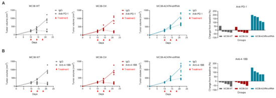 Immunotherapy response on MC38 tumors with different ACKR4 expression levels. (A) The mice were treated by anti-PD-1 on days 10, 14, and 18. The waterfall plot shows the individual tumor volume change post-treatment. The response of the ACKR4 knockdown group to anti-PD-1 treatment was worse than that of the other groups. (B) The anti-4-1BB agonist treatment showed similar results to the anti-PD-1 treatment. (WT: Wild type, Ctrl: Control, shRNA: Short hairpin RNA, PD-1: Programmed cell death protein 1, 4-1BB: CD137/Tumor necrosis factor receptor superfamily 9, IgG: Immunoglobulin G, ANOVA: Analysis of variance).