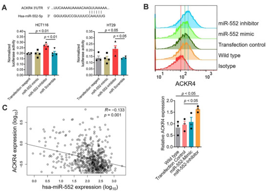 miR-552 downregulates ACKR4 expression in CRC tumors. (A) The sequence match between the miR-552 and the ACKR4 3′-untranslated region (UTR). Dual-luciferase assay confirmed that miR-552 binds to the 3′-UTR of ACKR4 (n = 4). (B) miR-552 inhibitors enhanced ACKR4 expression in HCT116 cells (n = 3, the red vertical dot line indicates the isotype group’s mean signal intensity, the green dot line indicates the transfection control group’s mean signal intensity, and the blue vertical dot line indicates the miR-552 inhibitor group’s mean signal intensity). (C) A negative correlation between ACKR4 and miR-552 in the TCGA colorectal cancer dataset (The black line is the regression line). (For more than two group statistical analyses, the uppermost p-value indicates the ANOVA-analysis, and other p-values indicate the posthoc analysis between two specific groups. miR: MicroRNA, Hsa: Homo sapiens, TCGA: The Cancer Genome Atlas, ANOVA: Analysis of variance).
