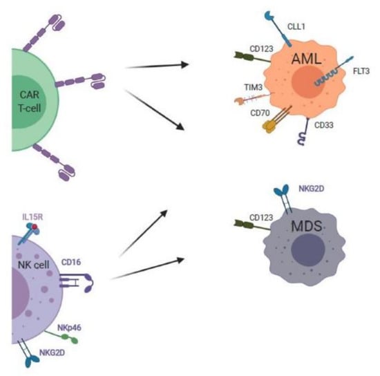 - Stevens, B.M.; Zhang, W.; Pullyea, D.A.; Winters, A.; Gutman, J.; Smith, C.; Budde, E.; Forman, S.J.; Jordan, C.T.; Purev, E. CD123 CAR T cells for the treatment of myelodysplastic syndrome. Exp. Hematol. 2019, 74, 52–63. [Google Scholar] [CrossRef]