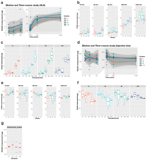 SQUID analysis showed an increase in iron uptake in the SLNs over time (Figure 2a–c, Table S2). An increase in iron uptake was seen six hours after injection (Figure 2c). The first hour showed no large difference in iron uptake. Although the effect of dilution was not apparent at most time points, the five- and ten-fold dilution group demonstrated an increased iron uptake after six hours, with little difference in iron uptake at 24 h (Figure 2b). Neat Resovist showed barely any uptake within the first hour after injection whilst all diluted volumes were actively taken up by the SLNs. The highest iron uptake was seen with the ten-fold diluted tracer after 10 min, 30 min, and 6 h and the lowest overall uptake was seen with neat Resovist. The uptake at 24 h was, however, very similar with all dilution volumes.