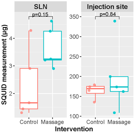 Massaging of the injection site had no significant increasing effect on the amount of iron taken up by the SLNs (Mann–Whitney U = 5.0, p = 0.15) if the SLND was performed 30 min after injection of the magnetic tracer (Figure 3). The SLNs on the massage side contained a slightly higher amount of iron (median 3.25 μg, range 2.90–4.62 μg) compared to the untreated side (median 1.67 μg, range 1.30–4.28 μg). No statistical significance in iron at the injection site was found between the massage and no massage groups (Mann–Whitney U = 11.0, p = 0.84). The injected site on the massage side contained a median iron amount of 173.65 μg (range 108.95–338.96 μg), and that of the untreated side had a median amount of 174.14 μg (range 135.55–251.22 μg).