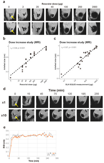 The size of the artifact at the SLNs increased with the injected dose of iron (Spearman’s rs (30) = 0.94, p < 0.001, Figure 4b, Table S1). In addition, a statistically significant correlation was found between the amount of iron in the SLNs determined by the SQUID and the artifact size (Spearman’s rs (30) = 0.97, p < 0.001, Figure 4c, Table S1).