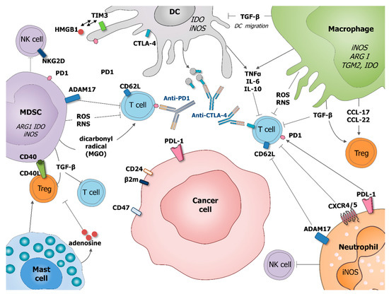 Role of tumor-associated myeloid cells in cancer cells immune-escape and therapy resistance. Macrophages and MDSC produce transforming growth factor beta (TGF-β) which inhibits DC migration at the tumor site, promote regulatory T cells (Treg) and block T cell activation. Macrophages potentiate Treg activation by production of chemokines CCL-17 and CCL-22. DC express immune checkpoint receptors, such as cytotoxic T-lymphocyte-associated protein 4 (CTLA-4), which can be released on the surface of microvesicles that could block costimulatory molecules, such as CD80/86. DC express also programmed cell death protein 1 (PD-1) and T cell immunoglobulin and mucin domain-containing protein 3 (Tim-3) interacting with HMGB1. MDSC suppress T cell functions by producing ROS and RNS inducing the nitration of TCR and MHC-I, as well as producing dicarbonyl radical methylglyoxal in the TME inhibiting CD8 T cells. MSDC express CD40 interacting with is ligand CD40L present on the surface of Treg. Mast cells can stimulate Treg numbers and secrete adenosine, which inhibits T cell proliferation. Neutrophil, as MDSC, expresses a disintegrin and metalloproteinase 17 (ADAM17) that cleaves the ectodomain of L-selectin (CD62L) on T cells. Neutrophil and cancer cells might express PD1 ligand (PDL-1) which inhibits activation of T cells expressing PD1. Neutrophils express CRCR4/5 leading to the immunosuppression of T-cell proliferation. MDSC and neutrophils, are also able to suppress NK cell cytotoxicity. By diminishing the response of various immune cells, tumor-associated myeloid cells can also negatively influence outcome of anti-cancer therapies, especially various immunotherapies.