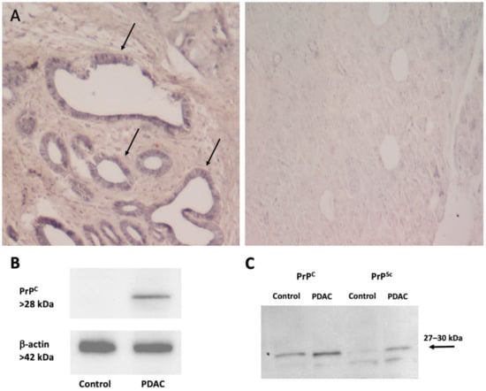 Notably, numerous lines of evidence support the potential role of PrPC in regulating cancer sensitivity to chemotherapy, and thus monitoring therapeutic efficacy and patients’ prognosis. For instance, Wang JH et al. (2011) [55] reported that a high PrPC expression in gastric cancer patients predicts both a poorer response to chemotherapy and a poorer prognosis. In fact, when compared with low PrPC expression group, patients with higher PrPC expression show increased resistance to chemotherapy, a lower 2-year survival rate and higher mortality rate [55]. Accordingly, PrPC over-expression in estrogen receptor (ER)-negative breast cancer patients is associated with a lower sensitivity to chemotherapy, thus suggesting that PrPC could be predictive for the benefit of adjuvant chemotherapy in ER-negative patients [56]. Expression of PrPc in human PDAC biopsies is associated with a worse survival than PrP-negative cases, supporting a critical tumor-promoting role of PrPC in PDAC [35]. Remarkably, western blot and immunohistochemical analyses from surgically resected specimens of PDAC demonstrate a marked difference between PDAC tissues compared to control. In detail, in PDAC specimens PrPC is overexpressed very selectively within the ductal compartment, whereas normal control tissues feature only few ductal epithelial cells with moderate PrP-staining [36] (Figure 2). Notably, PrPC expression was independent of the presence of dysplastic areas surrounding “healthy” pancreas, thus indicating that PrPC levels correlates with tumor invasiveness and aggressiveness, and not with preneoplastic lesions [36]. Although the mean patients’ follow-up is yet too short to correlate PrPC expression to clinical outcome, the authors report a significant difference between groups when analyzing the possible relationship between PrPC and cancer stage after resection based on pTNM [36]. Even if these data are yet preliminary in identifying PrPC as a potential biomarker in the follow-up of patients following surgical resection, they are nevertheless encouraging. However, further studies are needed to completely define a prognostic value of PrPC detection.