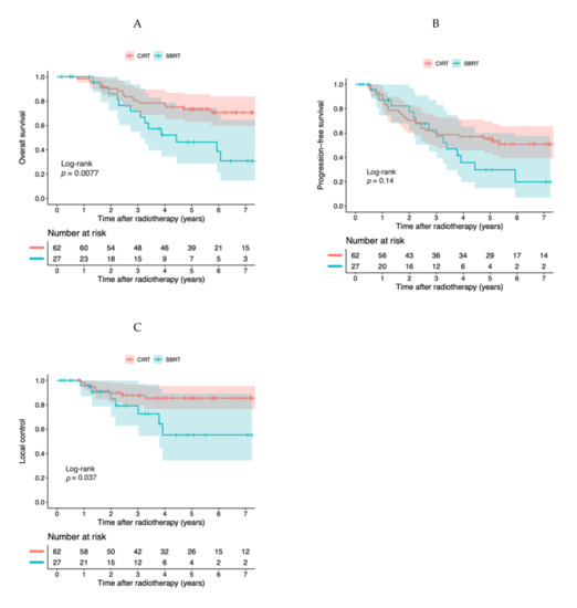 Furthermore, OS was favorable in CIRT in the present study. However, a previous systematic review and meta-analysis for Stage I NSCLC showed no statistically significant difference in OS between CIRT and SBRT [18]. A possible explanation for these results could be that the literature on CIRT included in their systematic review had a limited population from a single institution. Additionally, only medical inoperability was adjusted as a confounder in their study, but other factors, such as age, performance status, histologic type, and tumor size, which were considered prognostic factors in other studies [8,19,20], were not adjusted in their research. This situation may have affected their results. In our study, the numbers of younger patients and locally advanced tumors were significantly larger in the CIRT group. To eliminate potential bias derived from prognostic factors, we performed propensity score-adjusted analyses, which showed the survival advantages of CIRT.