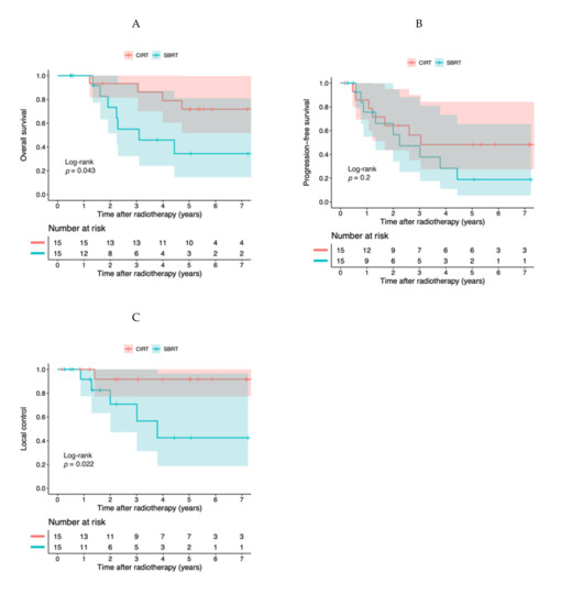 Log-rank tests were performed in the matched cohort. The 3-year and 5-year OS rates were 93.3% (95% CI, 81.5–100%) and 71.8% (95% CI, 51.8–99.6%) in the CIRT group, and 55.0% (95% CI, 32.2–93.8%) and 34.4% (95% CI, 14.1–80.9%) in the SBRT group, respectively, which were statistically significantly different (p = 0.043) (Figure 2A).