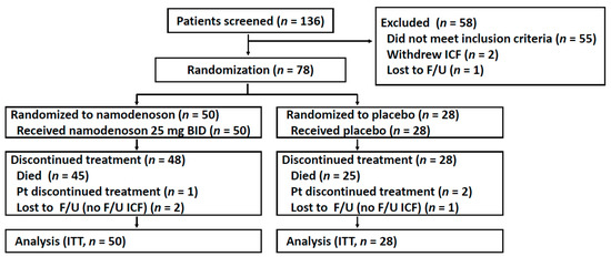 Flow chart of patient recruitment, treatment, and follow-up. F/U, follow-up; ICF, informed consent form; ITT, intention to treat; Pt, patient.