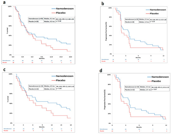 The primary endpoint was not met. Median OS was 4.1 months in the namodenoson group and 4.3 months in the placebo group (HR, 0.82; 95% CI: 0.49–1.38, p = 0.46) (Figure 2a). Progression-free survival (PFS) was 2.5 months in the namodenoson group and 1.9 months in the placebo group (HR, 0.86; 95% CI: 0.53–1.40, p = 0.54) (Figure 2b). The pre-planned exploratory analysis demonstrated that the difference between the arms in 12-month OS rate trended towards significance (32% [16/50] in the namodenoson group versus 14% [4/28] in the placebo group; p = 0.058).