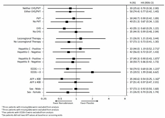 The exploratory analysis compared OS by treatment arm for various subgroups in the intent-to-treat (ITT) population (Figure 3). The subgroups involved stratification by sex, alpha-fetoprotein (AFP; ≤400, >400), Eastern Cooperative Oncology Group (ECOG) performance status (PS), hepatitis B and C status, locoregional therapy, extrahepatic spread status, and portal vein thrombosis status. None of the subgroups demonstrated a statistically significant difference between the namodenoson and placebo arms.