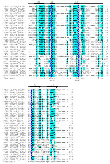 In contrast to the wider group of OB-fold proteins, the bacterial CSPs and eukaryotic CSDs are of very similar length of about 70 aa and share clearly conserved sequences. The presence of RNP1 and RNP2 sequence motifs [20] provided an early hint towards a function of CSDs in binding single-stranded nucleic acids. As in other RBPs, the RNP motifs [21] are placed within β-strands. These RNP motifs contain some of the most highly conserved residues in the set of representative bacterial CSPs and eukaryotic CSDs displayed in Figure 1. In general, sequence conservation in CSPs and CSDs is higher in β-strands than in loop regions. Whereas bacterial CSPs are small proteins consisting, as a rule, of a single CSD only, their eukaryotic homologs are proteins of variable length and domain composition.