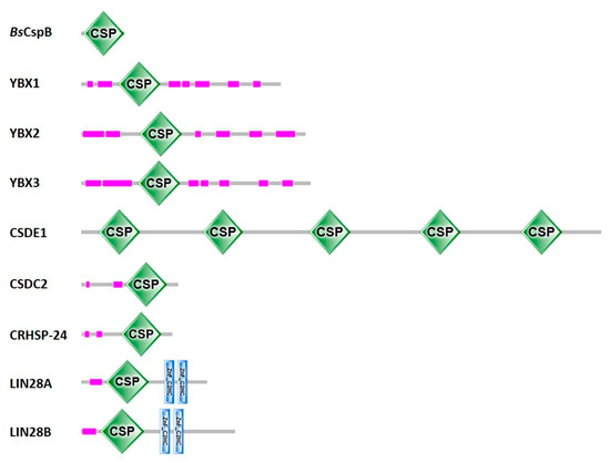 The large majority of CSDs are in single-domain bacterial CSPs. Gram-negative E. coli contains nine csp genes of which cspA, cspB, cspG and cspI are cold-inducible, while the others are not [28]. Gram-positive Bacillus subtilis contains three CSP paralogs, BsCspB, BsCspC and BsCspD [29]. In general, the number of CSPs in different bacteria is variable and evidently unlinked to habitat or preferred growth temperature. The larger eukaryotic proteins contain between one and five (or more) CSDs, frequently in combination with natively unfolded polypeptide regions and less often with other domains of known fold [30] (see Figure 2).