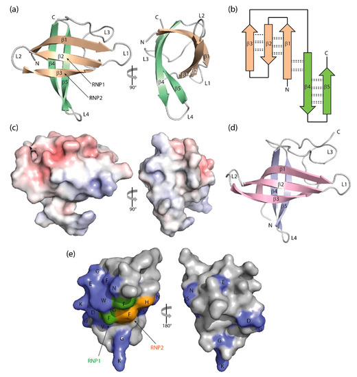 Three-dimensional structure of cold-shock proteins and domains determined at near-atomic resolution. (a) Cartoon drawing, (b) topology diagram with β-sheet stabilizing hydrogen bonds, and (c) electrostatic surface potential colored from red (−10 kT/e) to blue (+10 kT/e) of BcCspB (PDB entry 1c9o). (d) Schematic drawing of the X. tropicalis LIN28 CSD (PDB entry 3ulj). Orthogonal views are presented in (a,c). (e) Conserved residues on the surface of StCspE (PDB entry 3i2z). RNP1/RNP2, RNA-binding motifs [20]. Note the close structural similarity between the bacterial BcCspB [97] and the eukaryotic LIN28B CSD [100], the separation of negative (red) and positive (blue) surface charge in (c) and the asymmetric distribution of conserved residues over the CSP surface. Cartoon drawings were prepared with PyMOL [101], the topology diagram is based on PDBsum [102], and the electrostatic surface was calculated with the Adaptive Poisson-Boltzmann Solver (APBS) plugin [103] of PyMOL.
