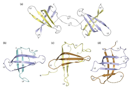 The single CSD and a tandem ZKD of LIN28 are both involved in nucleic-acid binding. The Xenopus tropicalis LIN28 CSD was shown to have a closely similar structure as bacterial CSPs (Figure 3d). The insertion of seven additional residues in loop L2 between β2 and β3 is accommodated by extending each strand by two residues and an altered loop structure [100].