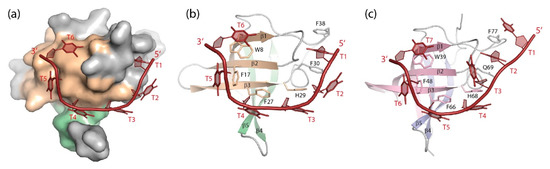 DNA single strands bound to CSDs. (a) Solvent-accessible surface and (b) cartoon drawing of BcCspB bound to (dT)6 ([113], PDB entry 2hax). Only one globular unit formed by two strands of a domain-swapped BcCspB dimer (see Figure 4) is displayed. (c) (dT)7 bound to LIN28B CSD ([100], PDB entry 4a76). Note how stacking interactions between nucleobases and aromatic amino-acid sidechains contribute prominently to the closely similar binding interfaces of the bacterial CSP and the eukaryotic CSD. Drawings prepared with PyMOL [101].