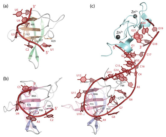 RNA single strands bound to CSDs. (a) GUCUUUA bound to BsCspB ([139], PDB entry 3pf4). The 5′ and 3′-terminal nucleotides of the co-crystallized RNA strand are not revealed in the structure. (b) UCAUCU bound to the YBX1 CSD ([11], PDB entry 5ytv). The 5′ and 3′-terminal nucleotides of the co-crystallized RNA strand are not revealed in the structure. (c) The microRNA precursor preEM-let-7d bound to the CSD and ZKD of mouse LIN28A ([140], PDB entry 3trz). Drawings prepared with PyMOL [101].