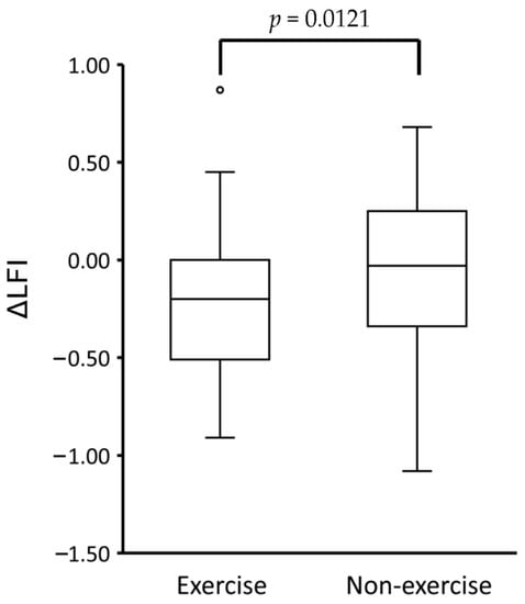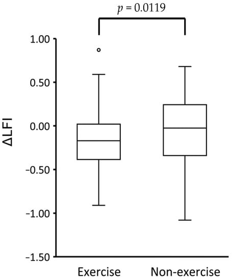 2.5. Differences in LFI Changes during Hospitalization between the Exercise and Non-Exercise Groups after Propensity Score Matching