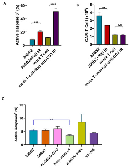 Inhibition of cell death enhanced chimeric antigen receptor-modified T cells (CAR-T) cell survival during activation. (A,B) CD20 targeting 20BBZ CAR-T cells or mock T cells were stimulated with irradiated CD20+ Raji cells, anti-CD3 expressing Raji cells, or were left unstimulated. Active caspase-3 was analyzed 24 h post stimulation by intracellular staining and flow cytometry (A). The numbers of live cells were counted and compared for each group (B). (C) 20BBZ CAR-T cells were stimulated with irradiated CD20+ Raji cell in the presence of the indicated cell death inhibitors. Active caspase-3 was analyzed 24 h later by intracellular staining and flow cytometry. Representative results of one from three replicate experiments are shown (A–C). Statistical significance was determined by unpaired t-test. Statistical significance was presented by ** p < 0.01, *** p < 0.001, **** p < 0.0001 and n.s ( not significant) (A–C).
