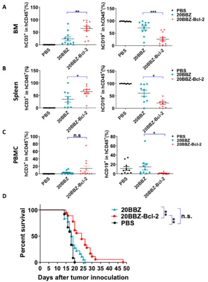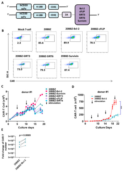 The following are available online at https://www.mdpi.com/2072-6694/13/2/197/s1, Figure S1: Comparison of long-term proliferation of 20BBZ CAR-T cells and 20BBZ CAR-T cells with the indicated anti-apoptotic molecules, Figure S2: Comparison of long-term proliferation of 20BBZ CAR-T cells and 20BBZ-Bcl-2 CAR-T cells, Figure S3: The mRNA expression levels of the indicated anti-apoptotic genes in 20BBZ-Bcl-2 CAR-T cells were analyzed by RT-qPC, Figure S4: 20BBZ CAR-T cells and 20BBZ-Bcl-2 CAR-T cells at different culturing time points were analyzed by flow cytometry and CD4+ CAR-T cell percentages were determined, Figure S5: Immunodeficient NOD/SCID/γ−/− (NSG) mice were intravenously inoculated with 3 × 105 Raji cells.