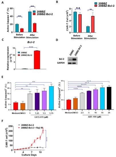 Bcl-2 is an anti-apoptotic gene shown to have broad anti-apoptosis ability in various cell types [21]. We initially investigated whether Bcl-2 could affect AICD during CAR-T cell activation. We found that 20BBZ CAR-T cells showed a higher basal rate of apoptosis compared to that of the 20BBZ-Bcl-2 CAR-T cells. After antigen stimulation, more than 50% of the 20BBZ-CAR-T cells were apoptotic, while only 20% of the 20BBZ-Bcl-2 CAR-T cells showed an apoptotic phenotype (Figure 3A). Furthermore, inhibition of apoptosis enhanced 20BBZ-Bcl-2 CAR-T cell survival (Figure 3B). To determine whether this reduced apoptotic phenotype was directly mediated by Bcl-2, we detected mRNA expression levels of other important anti-apoptotic molecules, such as B-cell lymphoma-extralarge(Bcl-xl), Myeloid cell leukemia-1 (MCL-1), Bcl-2-like protein-2 (Bcl-w), and caspase-3, using quantitative reverse transcription polymerase chain reaction (RT-qPCR). Bcl-2 mRNA and protein were significantly enriched in the 20BBZ-Bcl-2 CAR-T cells (Figure 3C,D and Figure S3), suggesting Bcl-2 played a major role in reducing AICD. To confirm this, we treated 20BBZ-Bcl-2 CAR-T cells with two Bcl-2 inhibitors, GX15-070 and ABT-199. GX15-070 is a pan Bcl-2 family inhibitor, which inhibits specifically Bcl-xl, Bcl-2, MCL-1, Bcl-w, Bcl-2 related protein A1(Bfl-1) and BCL-2-like protein-10 (Bcl-B) [22]. ABT-199 is a more specific selective Bcl-2 inhibitor, which inhibits the growth of Bcl-2-dependent tumors [23]. When 20BBZ-Bcl-2 CAR-T cells were treated with the Bcl-2 inhibitors, apoptosis significantly increased (Figure 3D). Accordingly, we predicted that Bcl-2 could sustain long-term T cell persistence in the absence of antigen stimulation. To test this, we cultured 20BBZ-Bcl-2 CAR-T cells in the absence of antigen stimulation, which was designed to mimic the in vivo setting when the antigen was cleared by T cells. While our 20BBZ-Bcl-2 CAR-T cells did not expand, they persisted after 11 days of culturing without unrestricted growth (Figure 3E), suggesting a prolonged survival advantage. These data collectively indicated that Bcl-2 is a predominant anti-apoptotic regulatory protein during CAR-T cell activation, which provides a potential target for enhancing CAR-T cell survival.