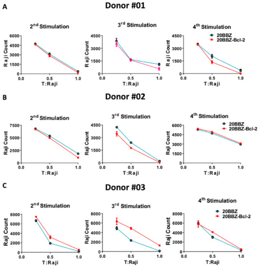 Cytotoxicity ability is the most important feature of CAR-T cells and directly determines their anti-tumor activity. To determine whether Bcl-2 signaling could enhance the cytotoxicity ability of CAR-T cells at different activation stages, we used repetitive antigen stimulation to mimic in vivo long-lasting chronic tumor burden. In this assay, T cells were re-stimulated every 6 days with irradiated CD20-positive Raji cells for a total of four times. Cells were harvested 4 days after each stimulation and incubated with live Raji cells at various T cell/tumor ratios (Figure 4A–C). To avoid the influence of percentage differences of CAR+ cells on cytotoxicity effect, we performed the tumor killing assay in vitro after the second round of stimulation with the irradiated Raji cells. After the second, the third, and the fourth stimulation with antigen, 20BBZ-Bcl-2 CAR-T cells exhibited similar cytotoxicity capabilities for various donors-derived CAR-T cells. These results suggested that, even though Bcl-2 significantly improved CAR-T cell survival, it had little impact on CAR-T cell cytotoxicity.