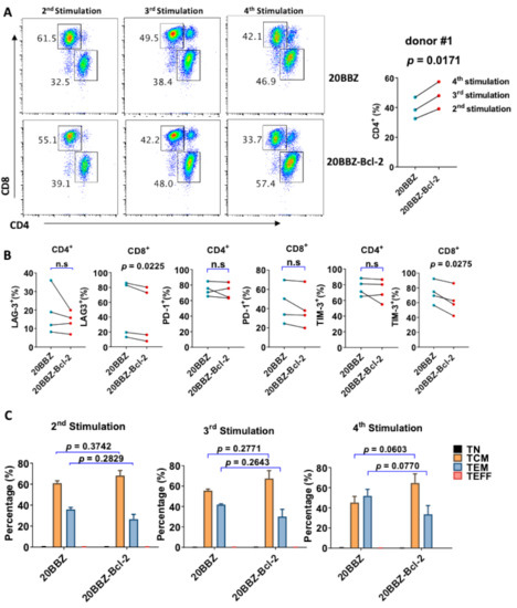 Bcl-2 has been reported to enhance T cell survival and promote memory T cell development [24,25]. We analyzed whether overexpression of Bcl-2 could affect the differentiation of CAR-T cells, focusing on CD8+ and CD4+ cell differentiation, memory status, and exhaustion of markers during the in vitro culture period. Interestingly, there was an increase in the portion of CD4+ cells among the 20BBZ-Bcl-2 CAR-T cells compared to that of the 20BBZ CAR-T cells after the first week of long-term culturing (Figure 5A and Figure S4). This suggested that the Bcl-2 signal predominantly affected the proliferation and/or the survival of CD4+ CAR-T cells over that of CD8+ CAR-T cells. To determine whether Bcl-2 signaling could affect the exhaustion status of CAR-T cells, we examined the exhaustion-related cell surface markers programmed cell death protein 1 (PD-1), T cell immunoglobulin and mucin domain-3 (TIM-3), and lymphocyte-activation gene 3 (LAG-3). We observed a slight decrease tendency in the expressions of LAG-3 and TIM-3 in CD8+ 20BBZ-Bcl-2 CAR-T cells compared with those in 20BBZ CAR-T cells (Figure 5B) after the fourth round of stimulation. Since Bcl-2 signaling can help preserve the central memory phenotype of T cells [26], we tested whether Bcl-2 signaling could affect the memory status of CAR-T in our newly designed construct. We found a slight increase tendency in the proportion of central memory T cells (CCR7+CD45RO+CD45RA−) and a slight decrease tendency in the proportion of effector memory T cells (CCR7−CD45RO+CD45RA−) in 20BBZ-Bcl-2 CAR-T cells during the culture period compared with those of 20BBZ CAR-T cells (Figure 5C).